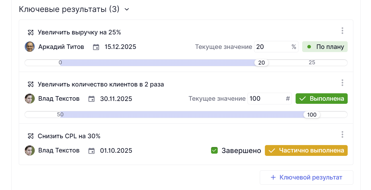 Добавили возможность добавлять и фиксировать ключевые результаты в целях.