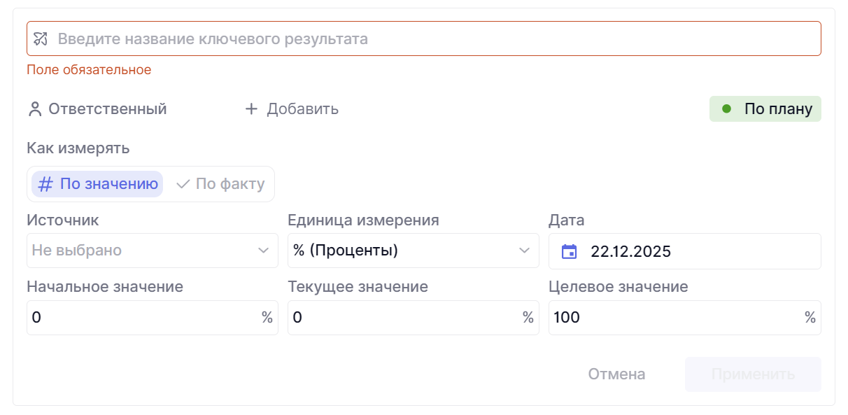 Создать ключевой результат очень просто – обязательным полем является только правильная постановка результата в его названии. Остальные данные опциональны и помогут сделать процесс отслеживания и измерения результата прозрачнее.