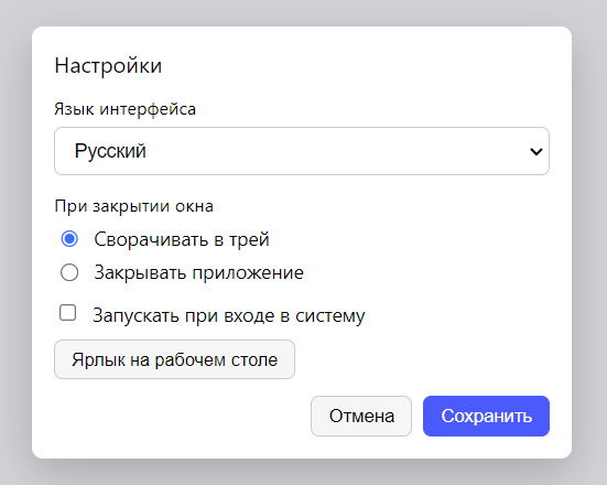 В параметрах вы сможете изменить язык интерфейса, поведение приложения при закрытии окна, а также включить автозапуск приложения при входе в систему.