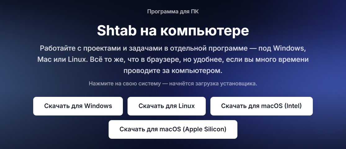 Десктоп-приложение — это версия Shtab, которая работает как отдельная программа на компьютере. Вам не нужно открывать браузер и искать вкладку, достаточно просто запустить приложение.