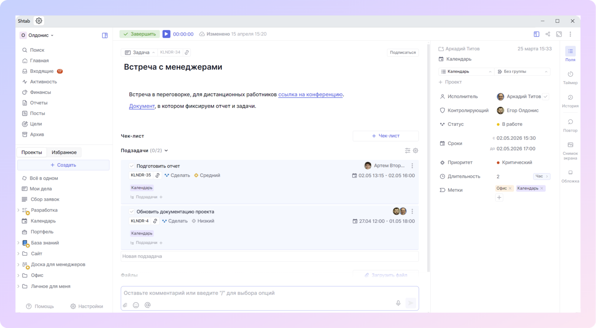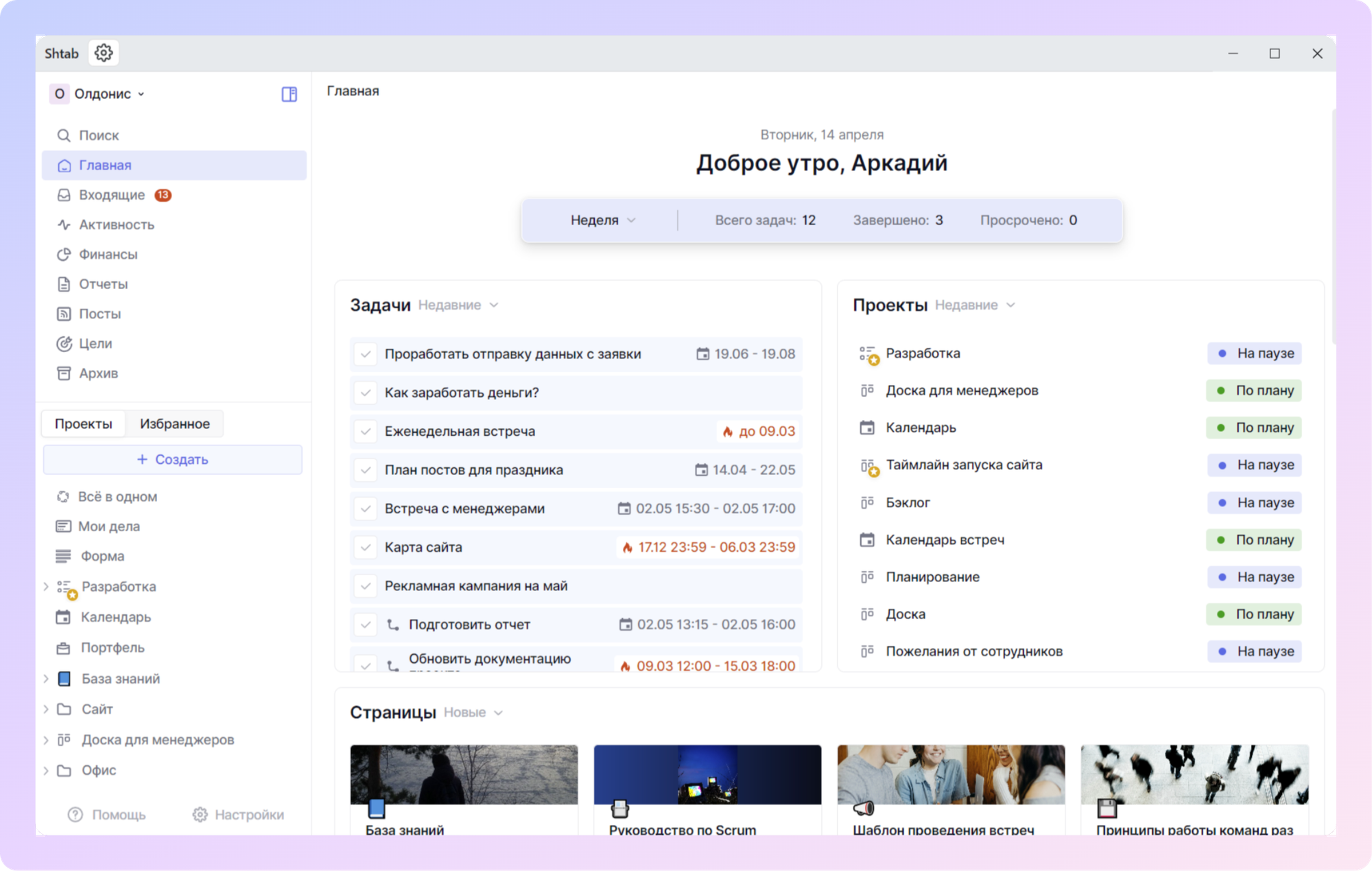 Это тот же самый Shtab, но в отдельном приложении, без лишних вкладок и отвлекающих факторов. Такой формат особенно удобен, если вы работаете в системе в течение всего дня, например, ведете задачи, заполняете базу знаний или управляете командой. Приложение всегда под рукой и не теряется среди других вкладок браузера.