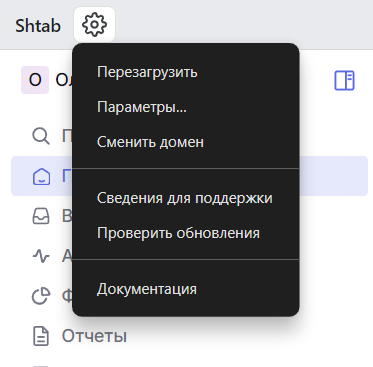 - Сменить домен – изменит домен для подключения и входа в Shtab (нужно для коробочных версий);