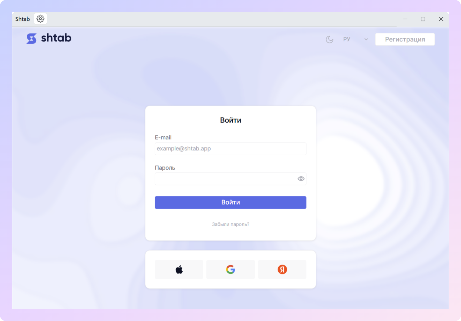 При первом запуске вы увидите окно авторизации в Shtab.
