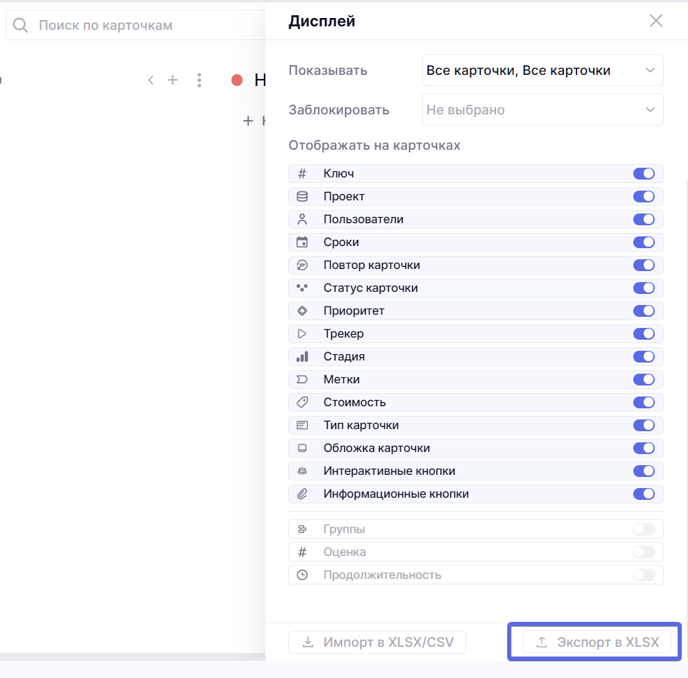 Для этого нажмите на кнопку Дисплей в правом верхнем углу и в появившейся правой панели выберите опцию Экспорт XLSX.