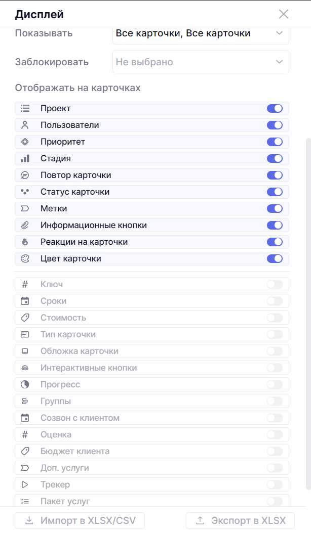 В эспортированном файле будут выведены те же поля, которые вы выбрали для отображения в карточке. Если поле выключено – в файле его не будет.