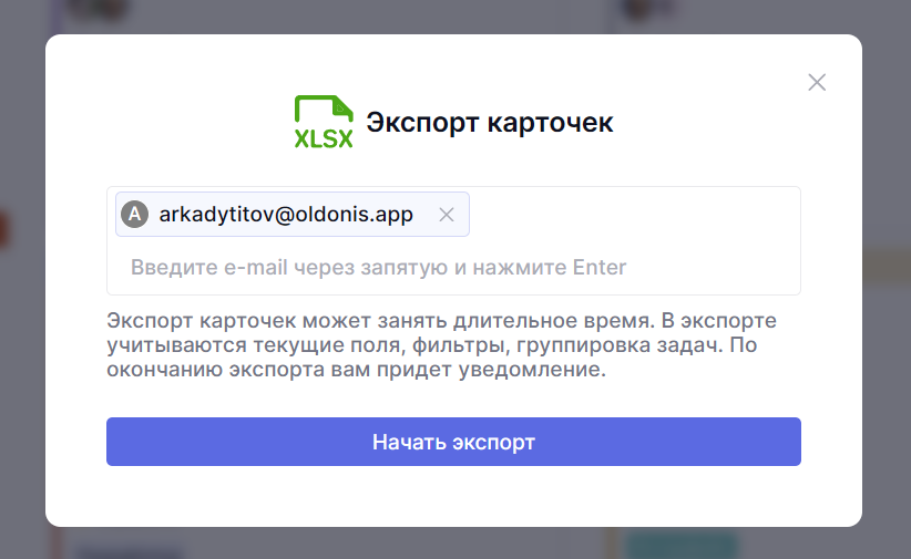 В открывшемся окне введите адрес почты или нескольких почт, куда придет файл с экспортом. А затем нажмите Начать экспорт.