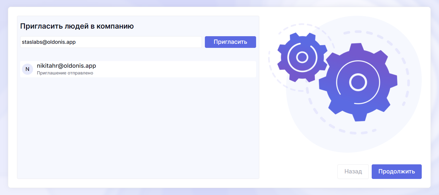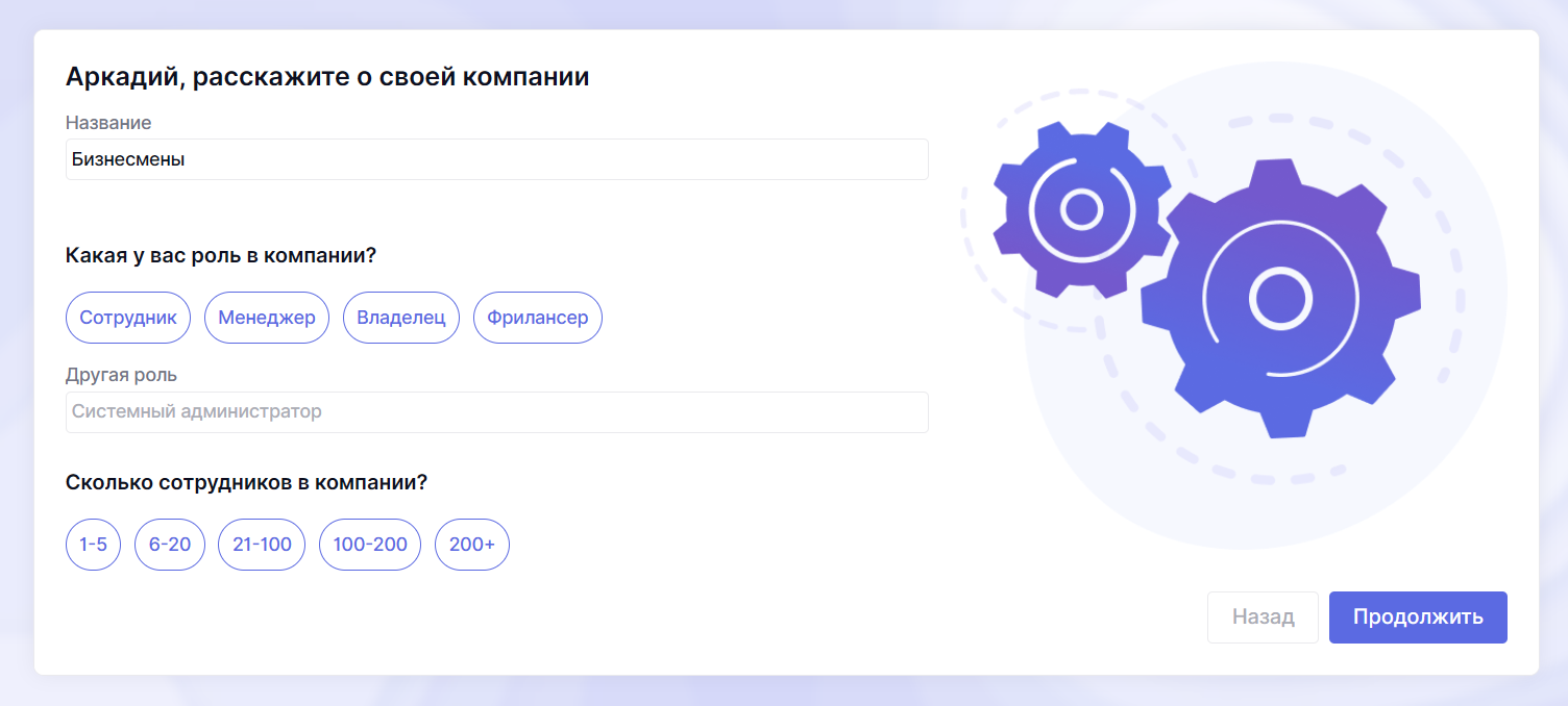 При регистрации вы указываете название компании и логотип, а также можете сразу пригласить коллег по электронной почте.
