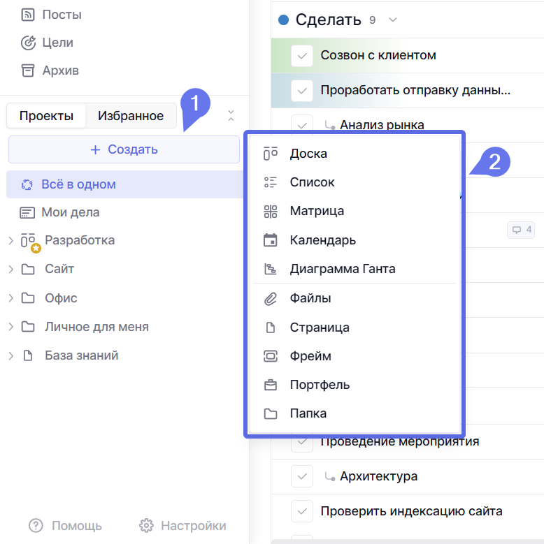 В проектах хранятся задачи и вся информация о них. Если вы не хотите, чтобы данные разных отделов или задач компании смешивались, рекомендуем создавать для каждого пространства свой проект.