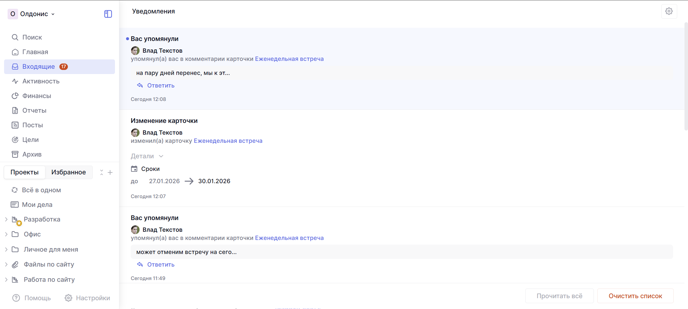 Помимо общих отображений задач есть ещеё два индивидуальных — Мои дела и Все в одном.
