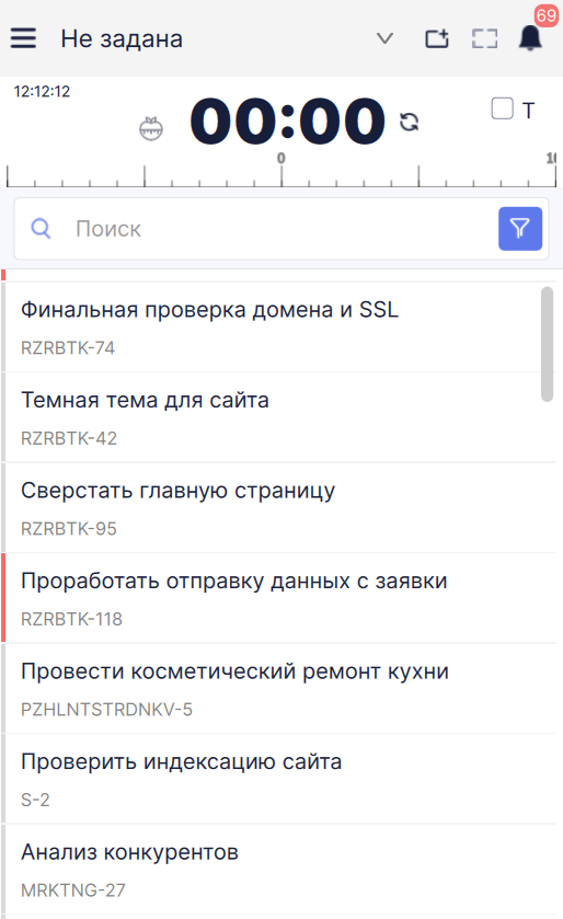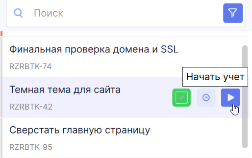 Для того, чтобы включить таймер по задаче, наведитесь на нее в трекере и нажмите на кнопку ▶️.