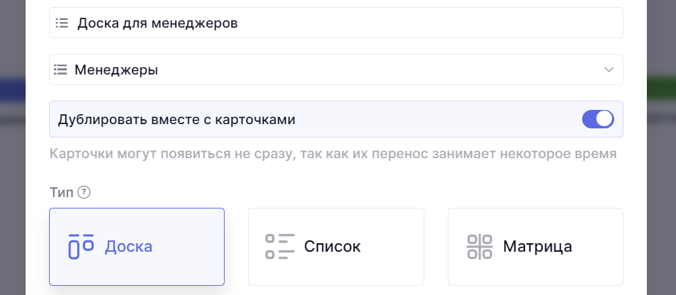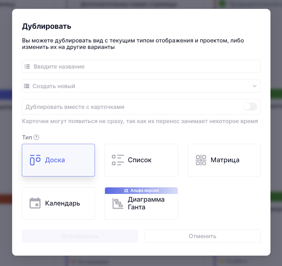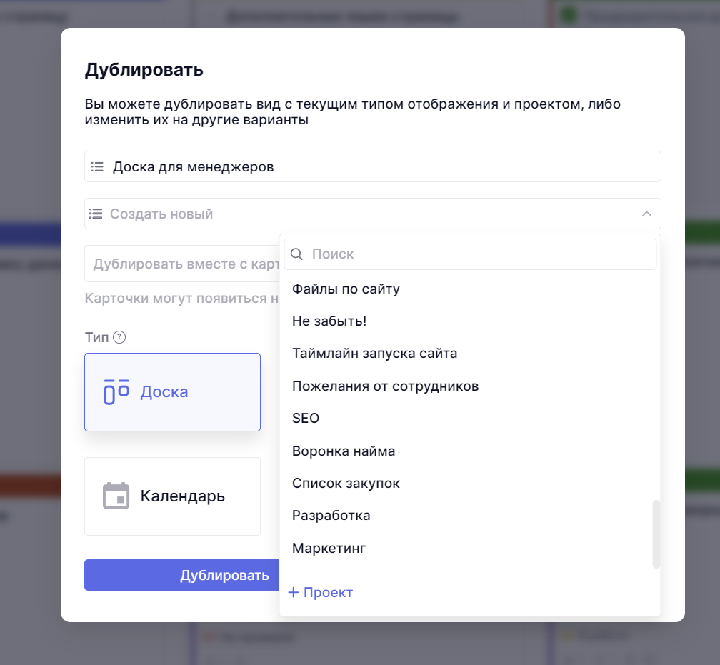 "По умолчанию" потому, что даже в новый проект таким образом можно будет скопировать карточки из уже существующего. Задачи у вас останутся в старом проекте и никуда не пропадут, а будут созданы их копии и прикреплены к новому проекту.