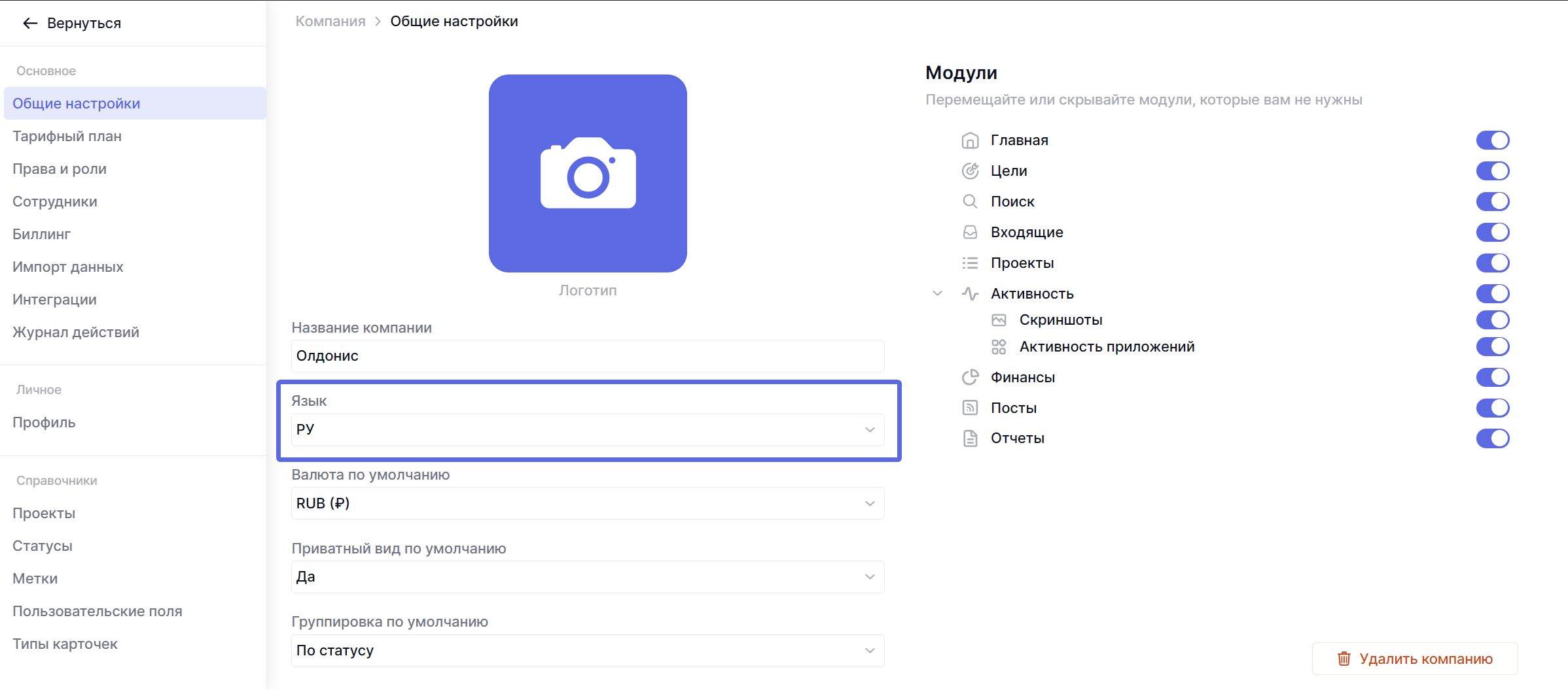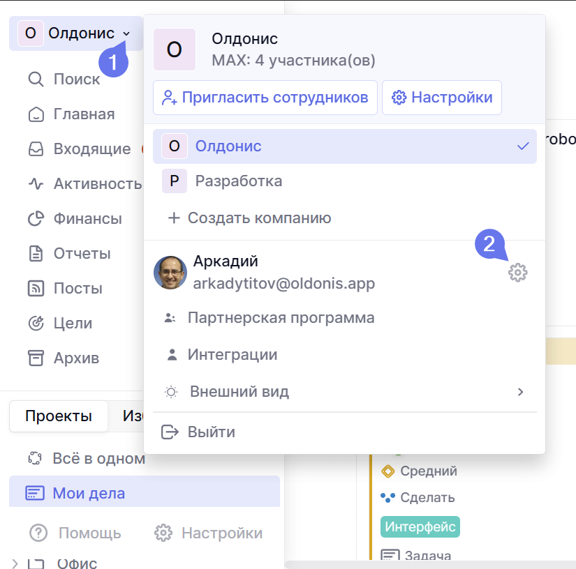В настройках своего профиля вы сможете изменить свой язык. Для этого нажмите на название компании в левом верхнем углу, а в меню нажмите на шестеренку.