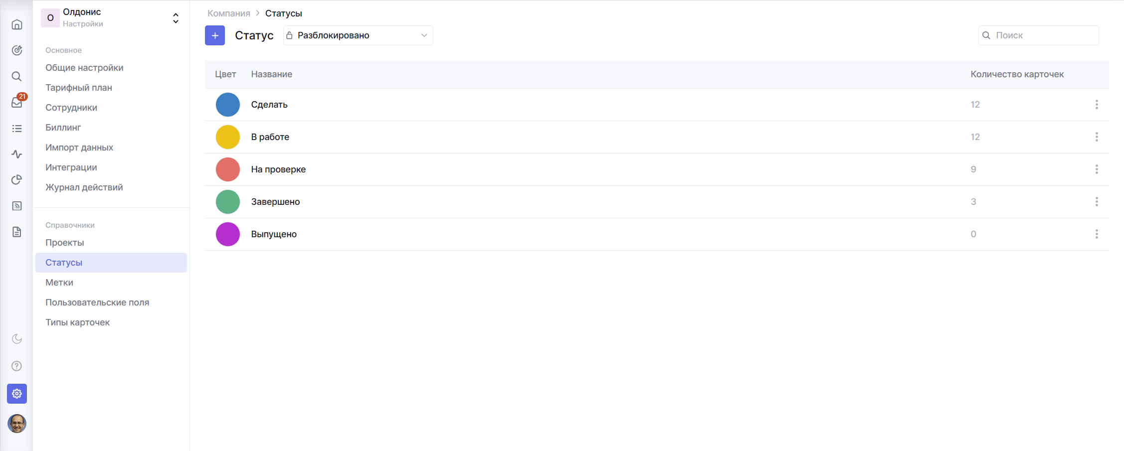 Чтобы навести его и выстроить нужный вам порядок колонок-статусов, перейдите в настройки команды через левое меню. Далее нажмите на Статусы в разделе Справочники: