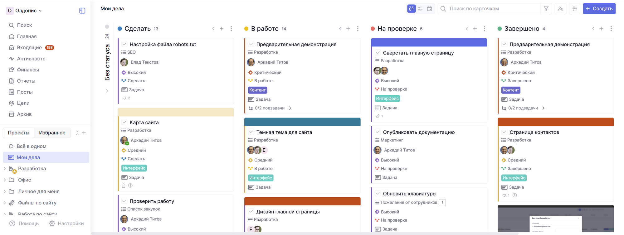 Если зайти в раздел Мои дела (или Все в одном), то можно увидеть статусы без какого-либо определенного порядка.