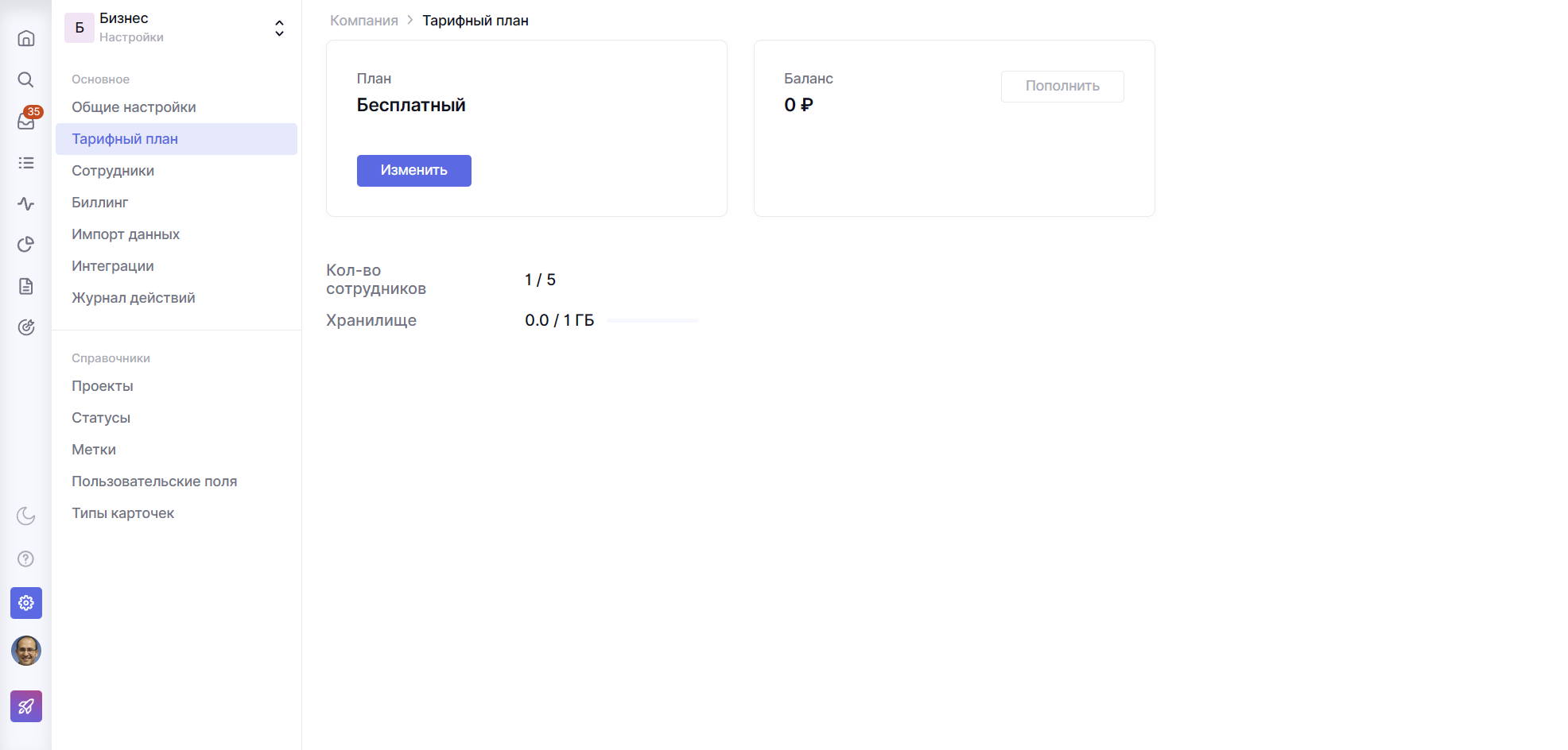 В настройках команды будет доступен раздел Тарифный план. Здесь отображается текущий тариф, баланс компании, количество активных и максимальных пользователей, а также объtм занятого и доступного хранилища.