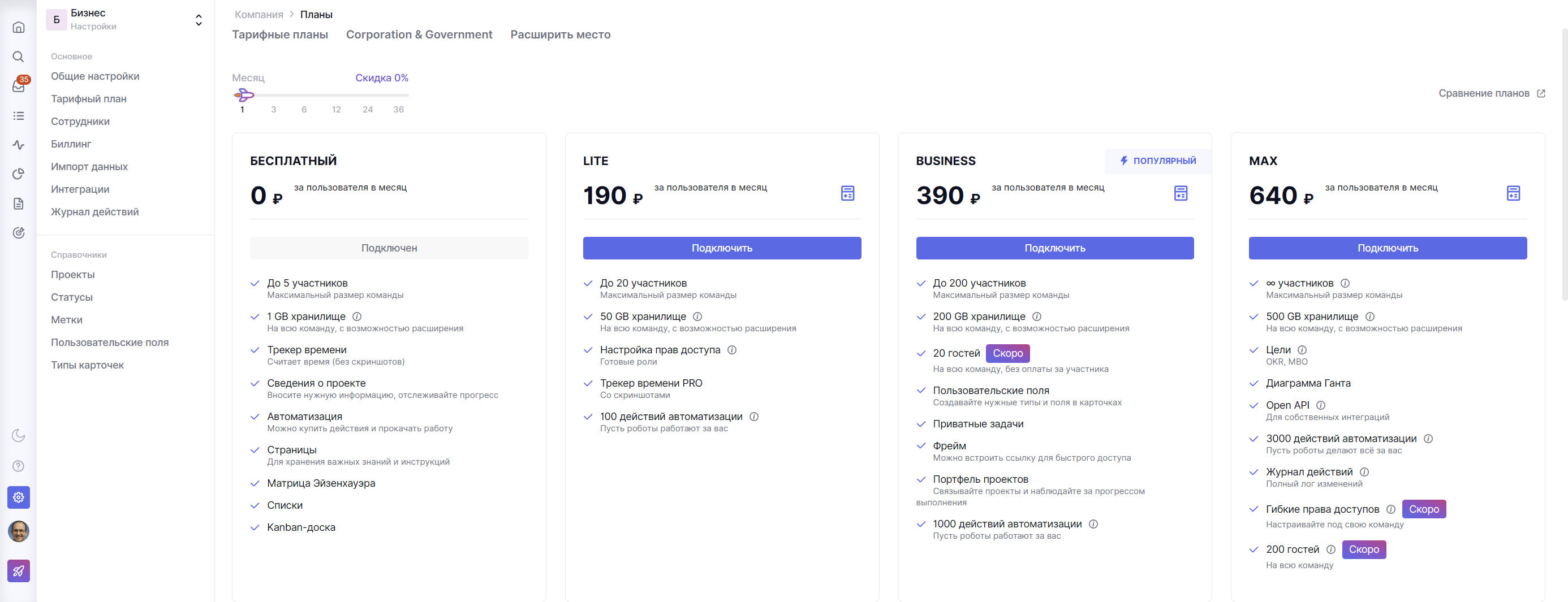 Вы можете работать на бесплатном тарифе без ограничений по времени. Однако, если нужно расширить команду или получить доступ к дополнительным функциям — например, к управлению правами доступа, пользовательским полям, портфелю проектов или диаграмме Ганта — стоит перейти на один из платных тарифов.