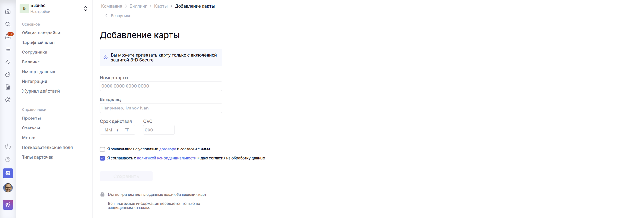 После привязки карты оплата произойдёт автоматически, и выбранный тариф сразу активируется, все новые функции станут доступны вашей команде.