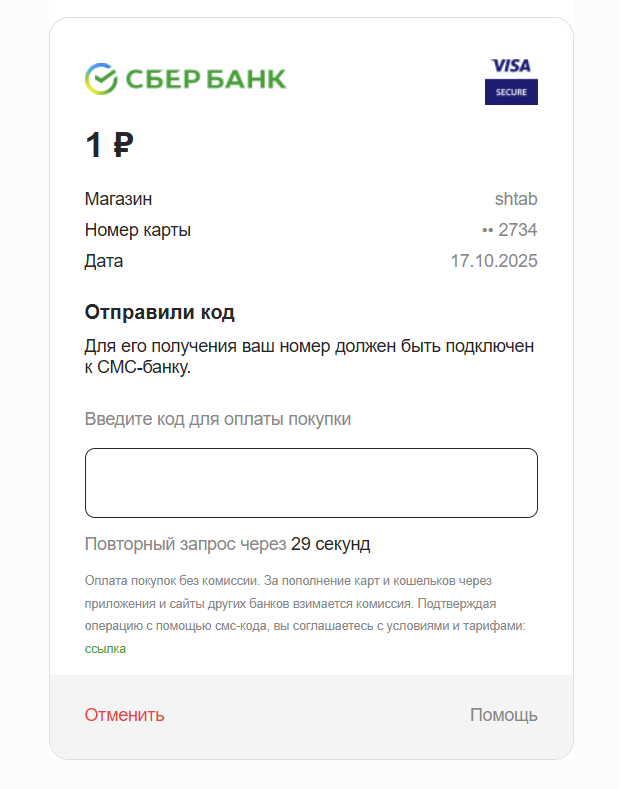 Далее откроется окно подтверждения операции для привязки карты. С карты для проверки ее активности будет списан 1 рубль, который потом сразу же будет возвращен. Введите код из СМС для подтверждения привязки.