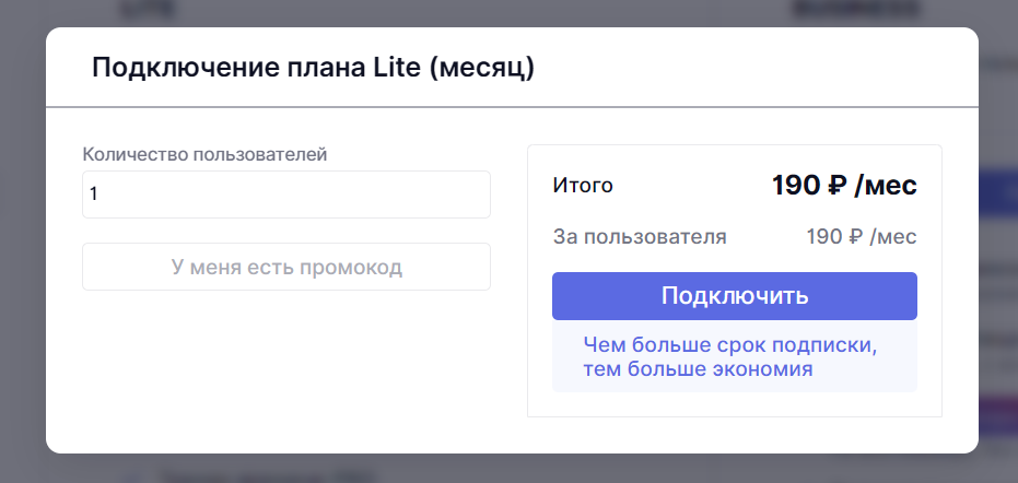 В верхней части страницы вы сможете изменить период, на который будет подключен тариф. Чем больше период, тем меньше сумма за пользователя.