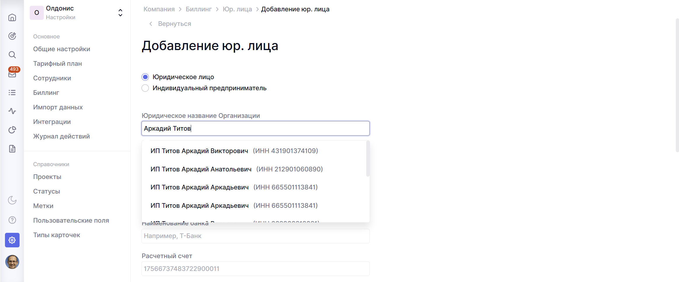 В поле с названием организации достаточно начать писать название вашей компании — система найдет подходящие варианты, останется выбрать свою компанию по ИНН. После выбора ИНН и юридический адрес подставятся в поля автоматически.