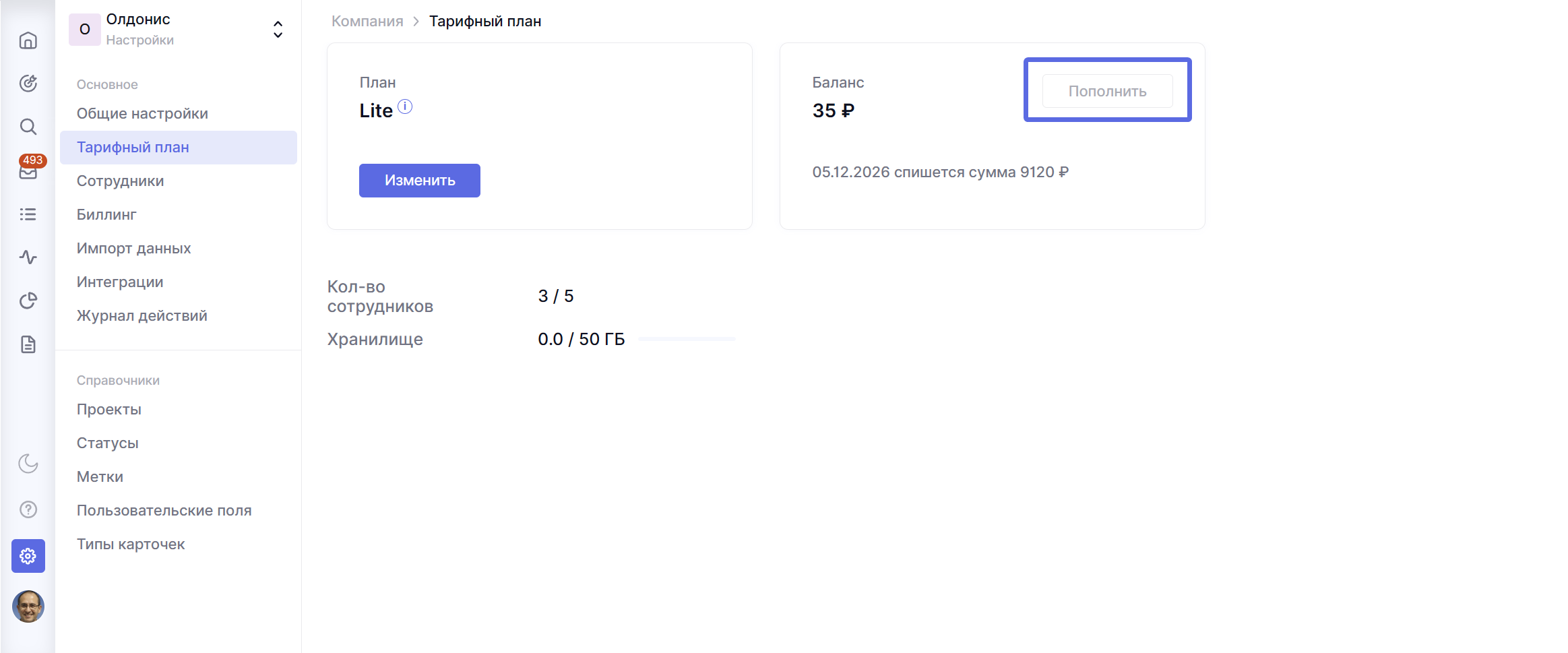 С помощью выставления счета по вашим реквизитам, вы сможете пополнить баланс вашей компании в Shtab, с которого затем можно оплатить тариф или увеличить количество пользователей. Для пополнения баланса перейдите в раздел Биллинг и нажмите на кнопку Пополнить.
