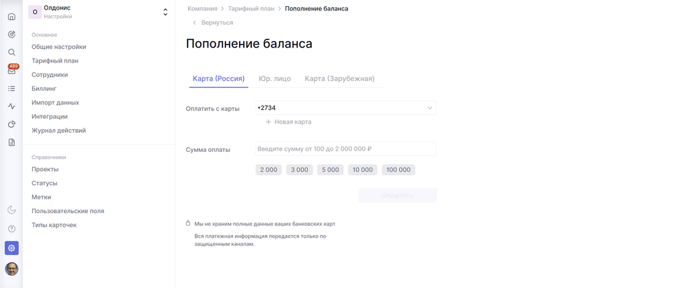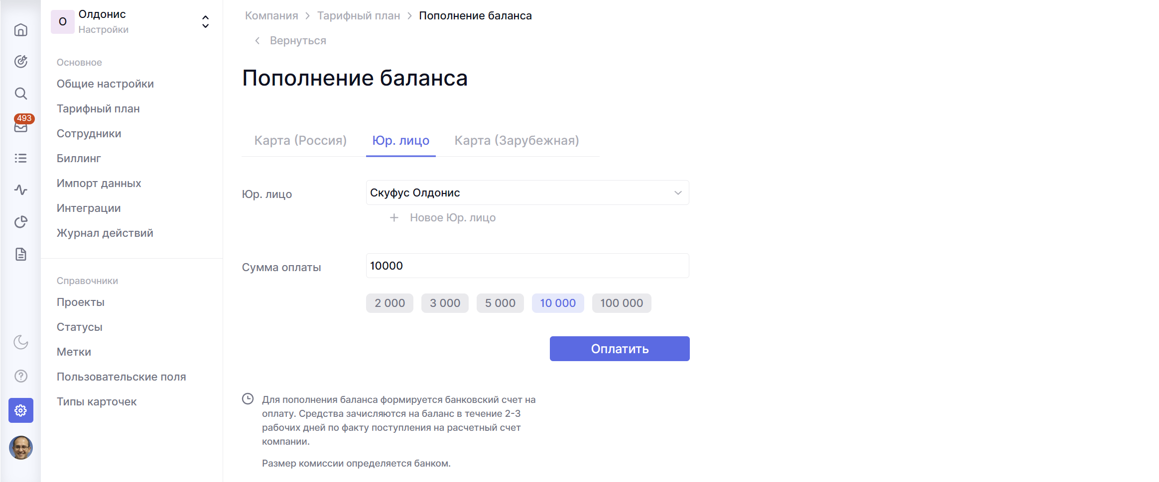 Укажите сумму в соответствующем поле и нажмите Оплатить. Деньги с карты будут списаны автоматически и почти сразу же поступят на баланс компании.