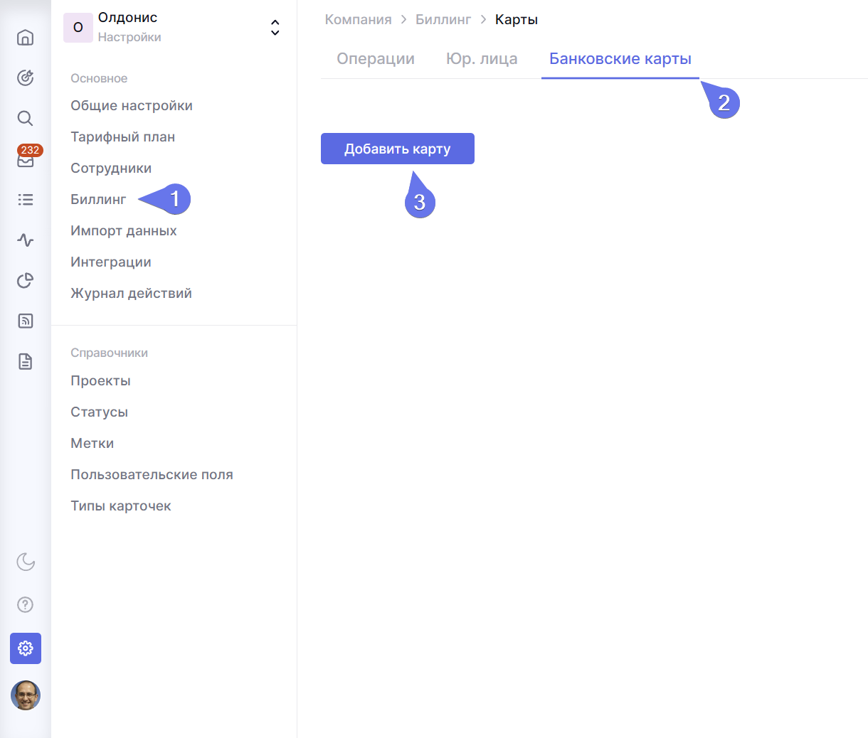 Помимо оплаты по счету, вы всегда сможете оплачивать Shtab и по карте. Для этого нужно будет привязать карту к системе, чтобы с нее могли происходить списания. Это можно будет сделать в разделе Биллинг во вкладке Банковские карты.