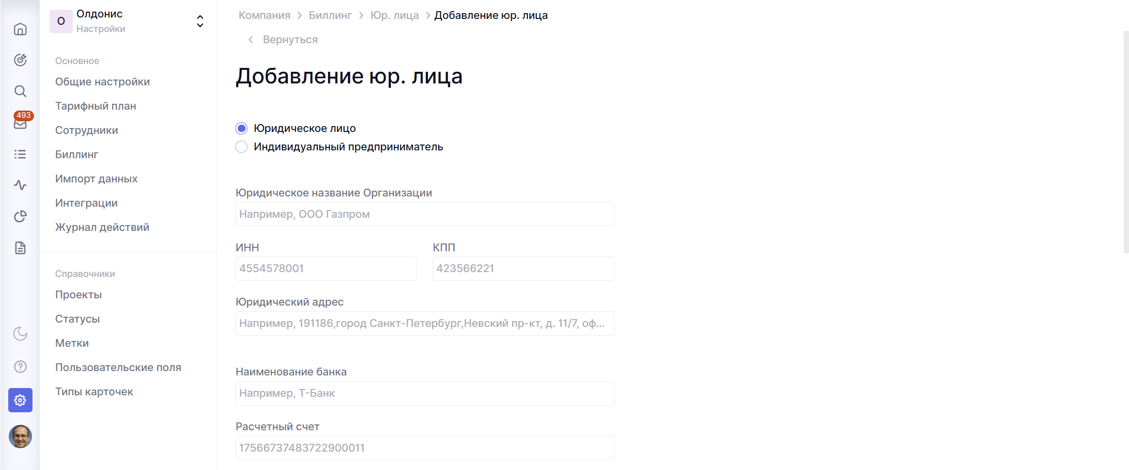 Чтобы выставлять счет по вашим реквизитам, сначала их нужно добавить в систему. Для этого откройте настройки команды, зайдите в раздел Биллинг и выберите вкладку Юр. лица.