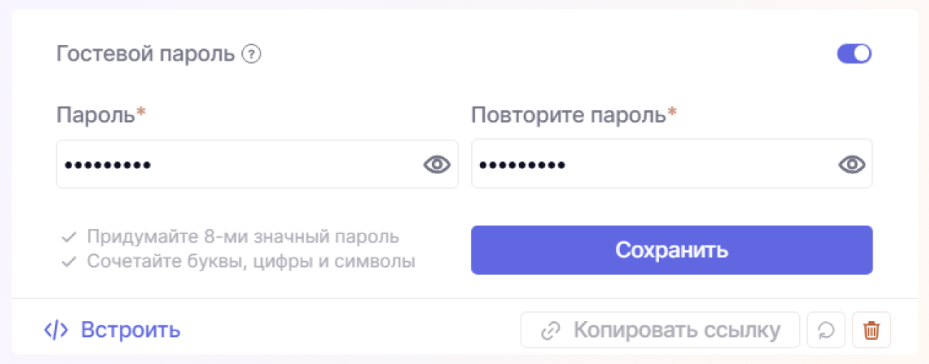 Чтобы дополнительно обезопасить сохранность данных, есть возможность установки гостевого пароля. Без него открыть информацию не получится, поэтому одной только ссылки будет недостаточно, гостям обязательно нужно будет ввести пароль.