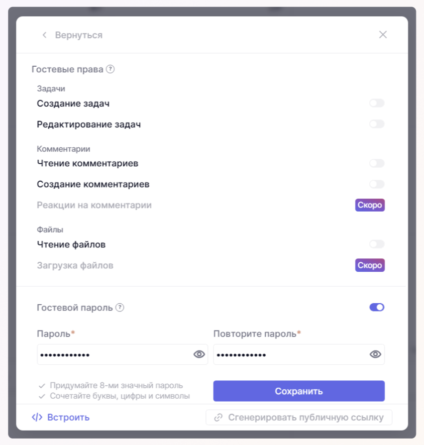 Существуют две опции для гостей – Создание задач и Редактирование задач. При включенной опции Создания задач гости смогут создавать новые карточки.