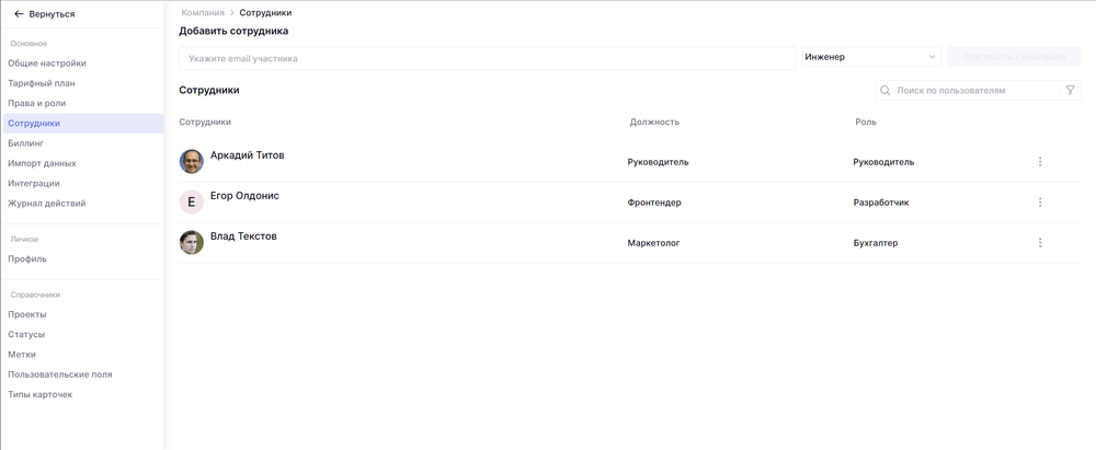 - Пользователь – базовый уровень доступа. Может создавать и редактировать карточки, просматривать активность и выплаты, работать с рабочими пространствами, но не имеет доступа к управлению командой или настройкам.