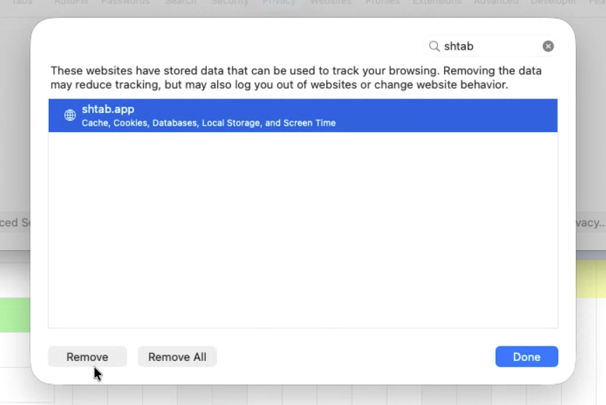 - Далее вбейте в поисковую строку Shtab, чтобы быстрее найти наш сайт, нажмите на него, а далее кликните на опцию Удалить в левом нижнем углу.