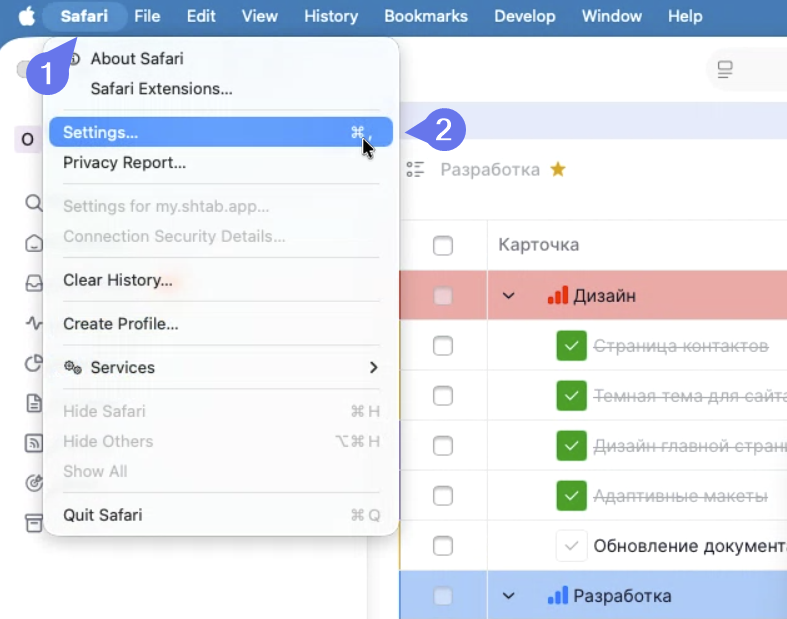- Нажмите на кнопку Safari в левом верхнем углу и выберите пункт Настройки