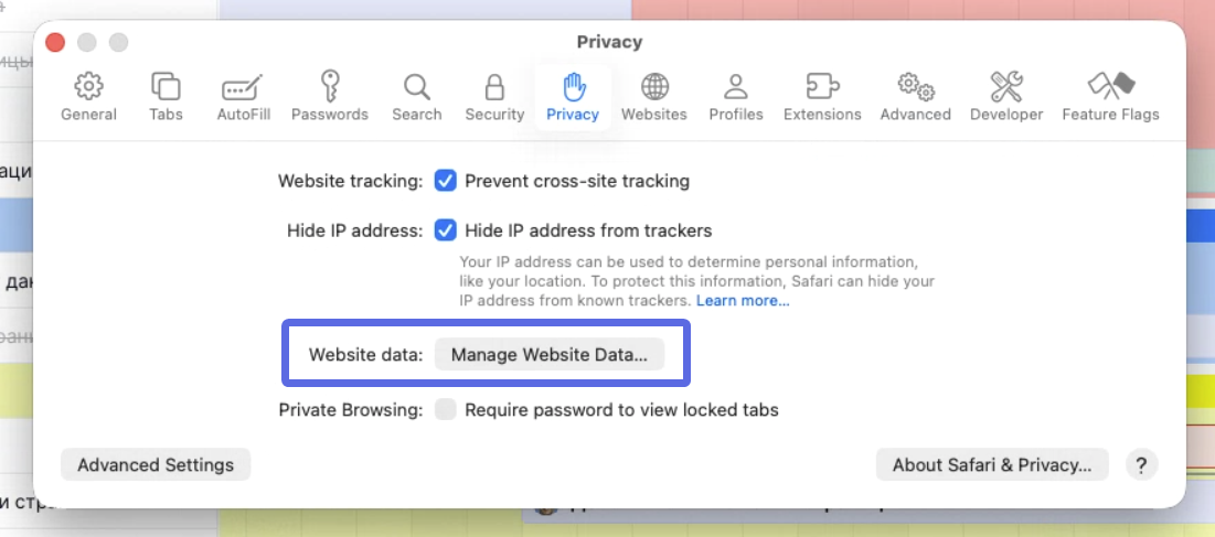 - В меню выберите раздел Приватность и нажмите на кнопку управления данными сайта