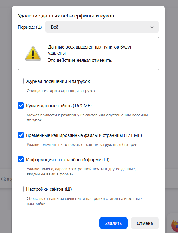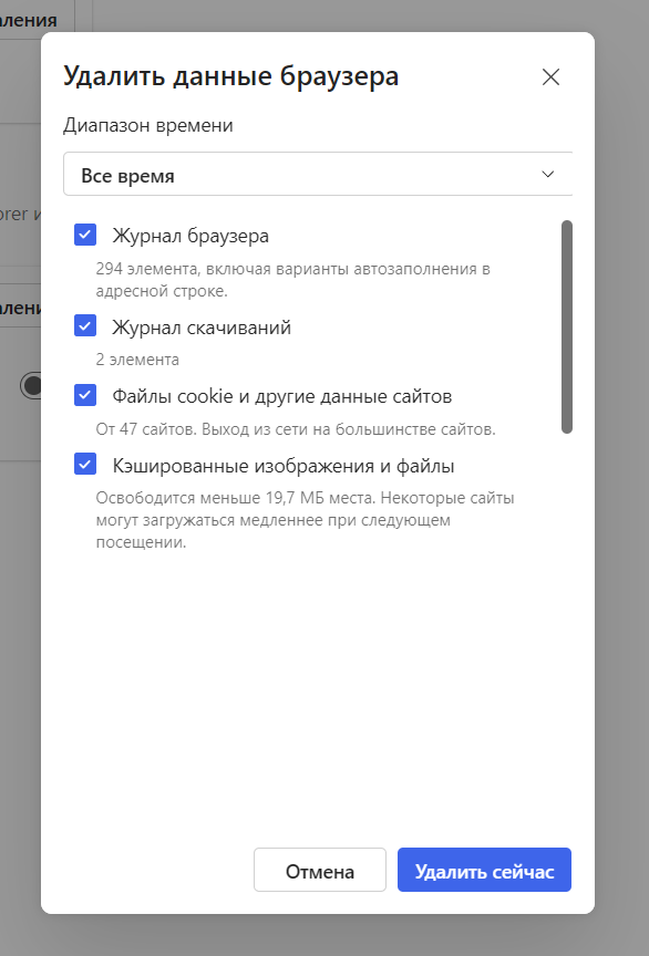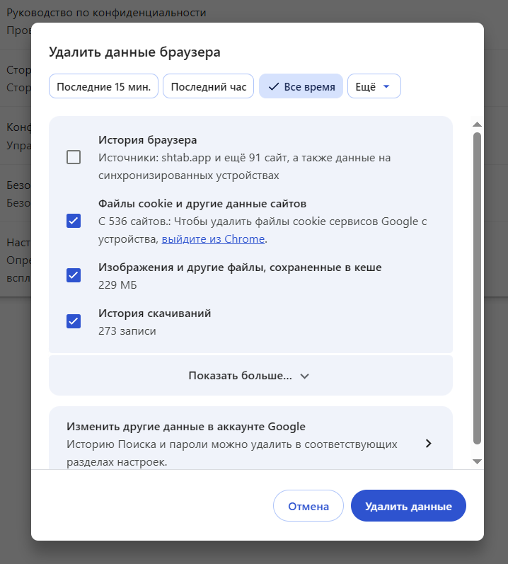 - Выберите нужные опции для удаления. Периодом стоит выбрать Все время, чтобы удалились все данные по нашему сайту.