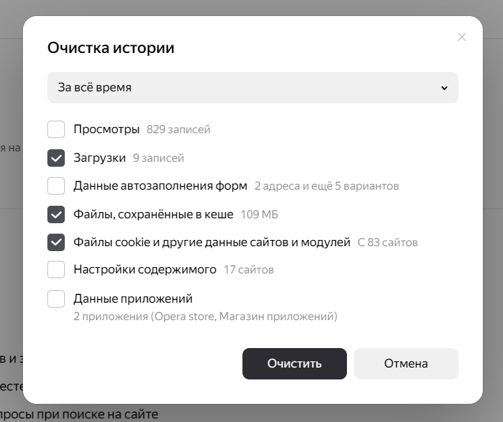 - Обязательно включите опции Файлы, сохраненные в кеше и Файлы cookie и другие данные сайтов и модулей. Периодом стоит выбрать За все время, чтобы удалились данные по нашему сайту вне зависимости от их времени хранения.
