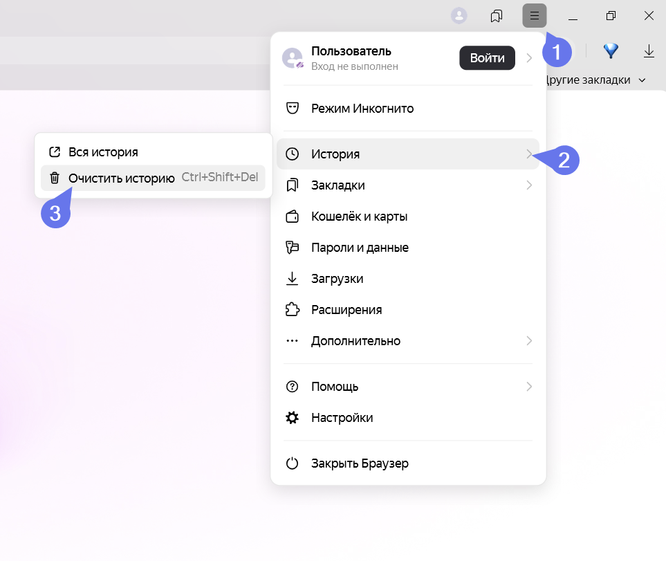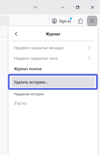 - Нажмите на значок меню (три горизонатльные линии), в выпадающем списке нажмите на пункт История, а затем выберите Очистить историю