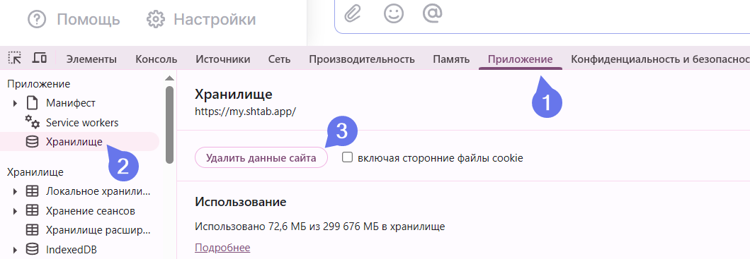 Иногда бывает так, что одной очистки кэша недостаточно — проблемы в интерфейсе остаются или приложение продолжает вести себя странно. В таких случаях помогает полная очистка локального хранилища браузера.