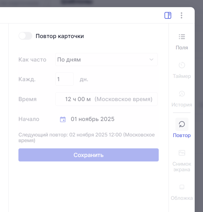 Если же у вас уже есть готовая карточка, которую нужно сделать повторяемой, просто откройте её, перейдите на вкладку Повтор и включите ту же опцию. В этом случае автоматически создастся шаблон, по которому система будет создавать карточки в заданный период и время.