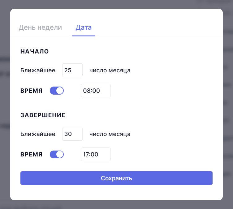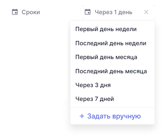 Например, если карточка создана 1 ноября и выбран сроки Через 3 дня, срок окончания будет 4 ноября.