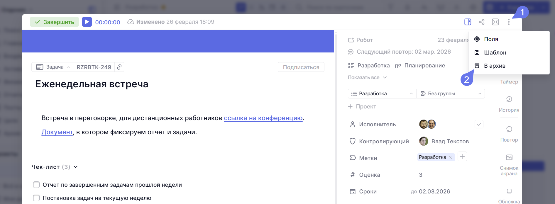 То же самое можно сделать прямо из вида — через три точки напротив названия, не открывая карточку. Либо нажмите на задачу правой кнопкой мыши.