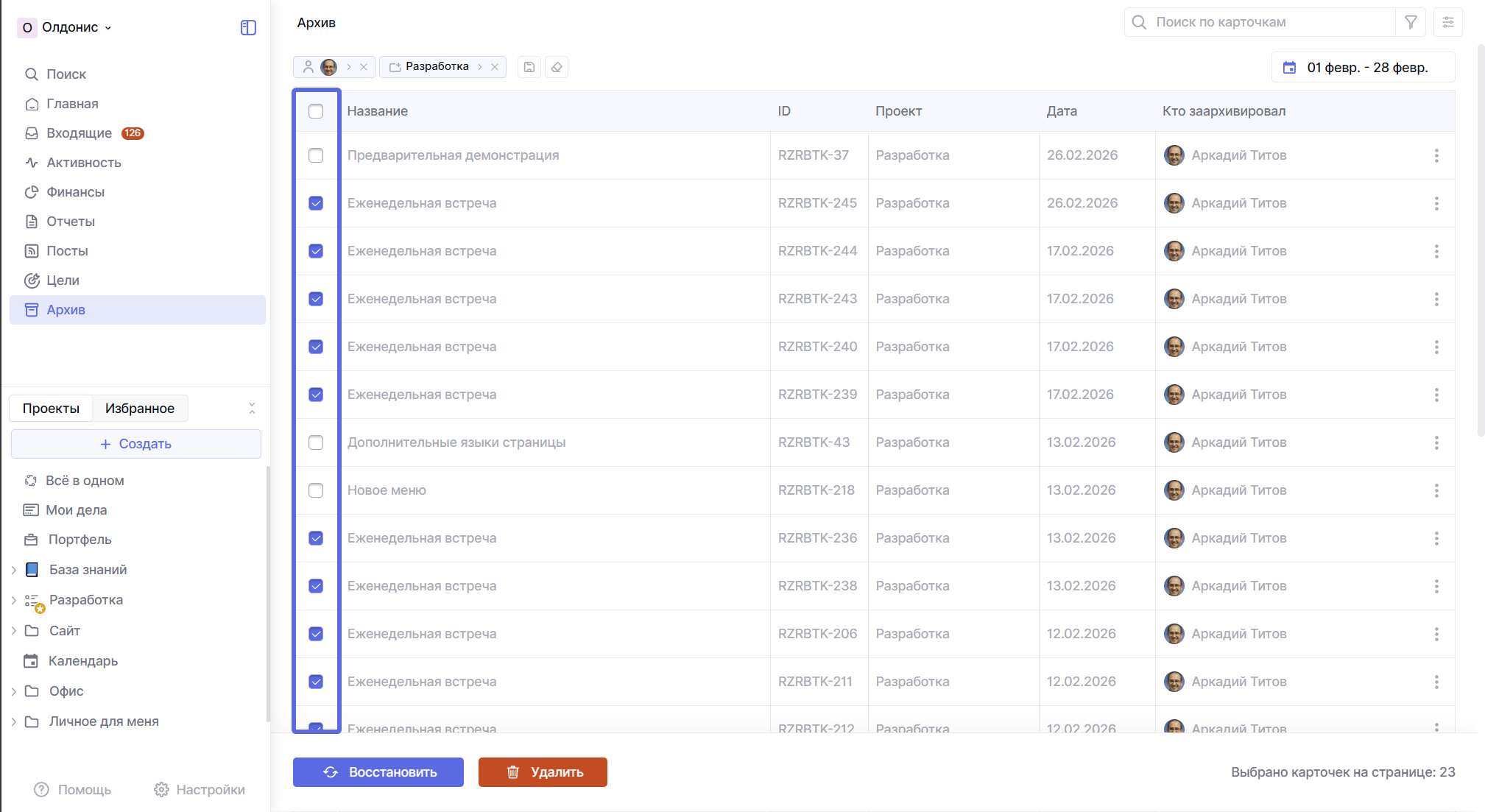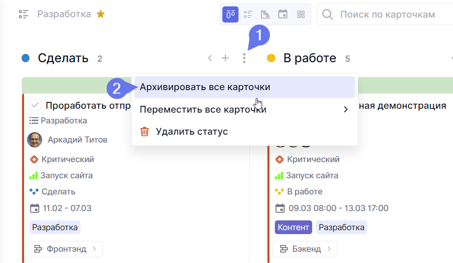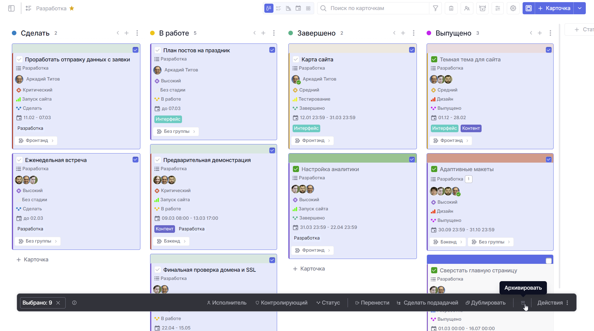 Также можно массово архивировать карточки. Выделите их и в меню массовых действий выберите опцию архивирования.