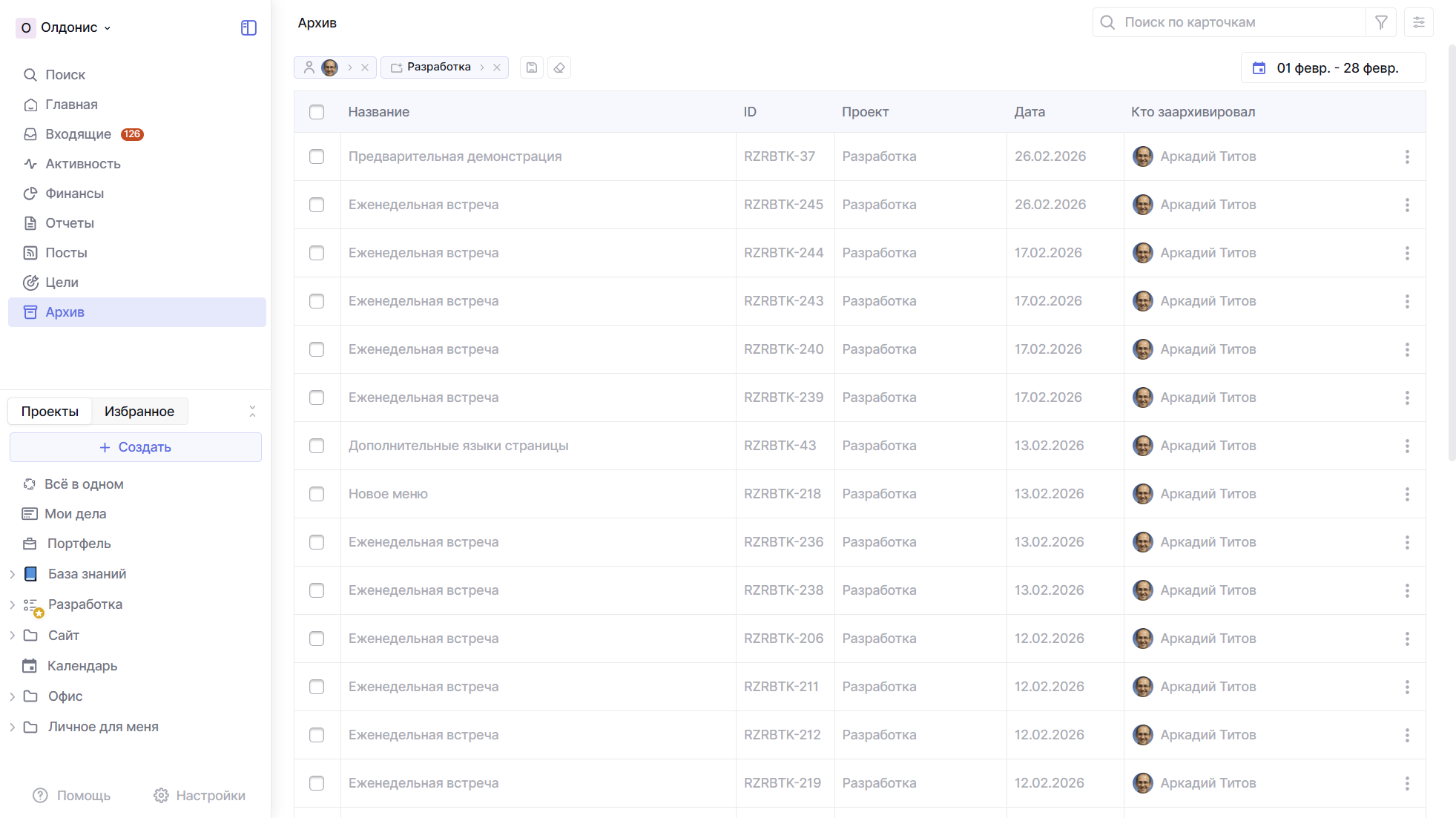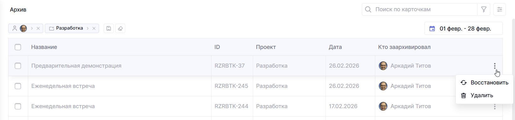 Чтобы в пространстве был порядок, регулярно проверяйте карточки. Если задача больше не актуальна — отправьте ее в архив или удалите.