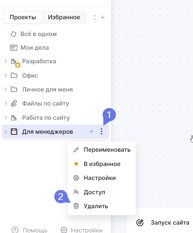 Чтобы удалить пространство, в левом меню нажмите на три точки рядом с ним и выберите пункт Удалить.