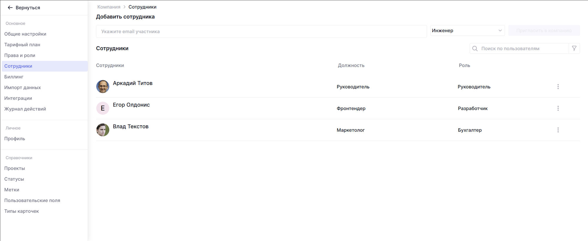 Удалить участника могут только администраторы или же сотрудник, имеющий доступ к списку пользователей. Чтобы это сделать, зайдите в настройки команды и откройте вкладку Сотрудники.