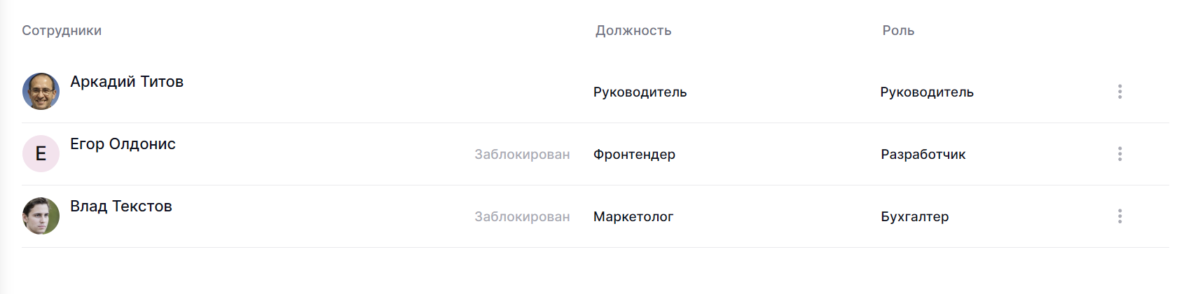 Чтобы заблокировать сотрудника, в списке пользователей нажмите на три точки рядом с ненужным пользователем, выберите опцию Заблокировать и подтвердите действие. В строке с ним появится надпись Заблокирован.