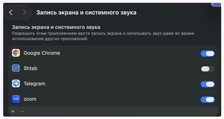 Также в настройках перейдите в раздел Конфиденциальность и Безопасность, найдите выдачу прав для Записи экрана и поставьте галочку рядом с нашим приложением Shtab. Это нужно для того, чтобы разрешить трекеру делать скриншоты экрана во время работы за компьютером.