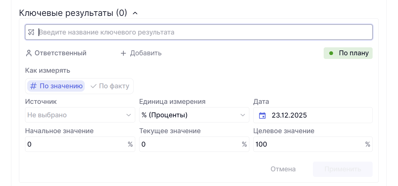 Добавить свои результаты можно будет по клику на кнопку + Ключевой результат внутри цели.
