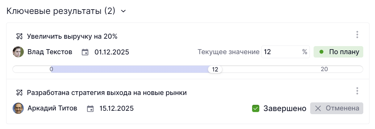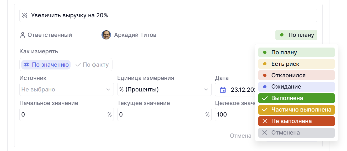 А сами статусы у результата точно такие же, как и цели. На выбор доступны статусы "По плану", "Есть риск", "Отклонился", "Ожидание", "Выполнена", "Частично выполнена", "Не выполнена", "Отменена".