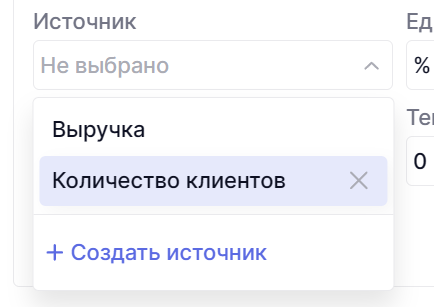 Например, источник с названием Выручка позволит нам понять, что результат измеряется в деньгах. А источник Количество клиентов измеряется в числовых значениях. Для измерения еще можно использовать и проценты.